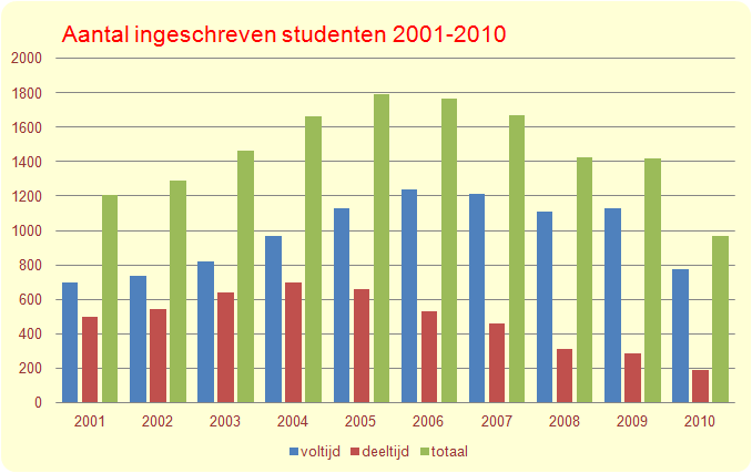 Het studentenaantal neemt nog wat toe, blijft dan min of meer constant gedurende een deel van het decennium. Tegen het einde van loopt het weer terug, mede door een -aanvankelijk- niet verleende accreditatie. (Bron: Jaarverslagen 2009, 2010) |