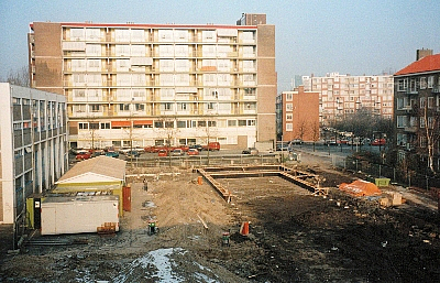 Hier wordt de oostvleugel gebouwd. Links de buitenmuur met de opvallend kleine ramen. Deze ramen moesten klein blijven en laag geplaatst worden om teveel inkijk richting de buurflat te voorkomen. Inmiddels is deze flat gesloopt (2010). Rechts de grote ramen die uitzicht geven op het binnenplein. In het middendeel worden de lokalen geconstrueerd. |