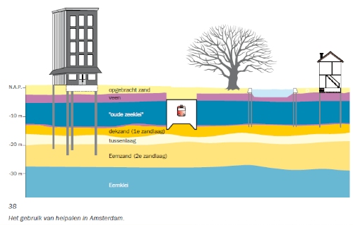 | De ondergrond van Amsterdam bestaat voor een groot deel uit veen. Op veen kun je niet bouwen, dus moet je het gebouw op palen zetten, en die moet je de grond inslaan (heien) of inboren. De Ipabo Amsterdam staat op palen van ongeveer 18 meter (op de zogenaamde 'tweede zandlaag'). Maar óp de veenbodem, die wel met een laagje zand is afgedekt, legt men de tegels van de binnenplaats. En veen klinkt in. Door waterverlies kan het een groot volume verliezen. Die inklinking is op verschillende plaatsen te zien. Peer vertelt daar iets over. (Interview 2011; 1:15) |