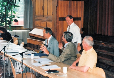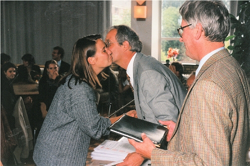 Docenten bij een diplomering in 1996. Het was de (goede!) gewoonte dat de docent bij wie een kandidaat de eindscriptie had gemaakt, deze kandidaat bij de diplomering toesprak (een soort laudatio), zoals hier Herman Olde. Docenten stellen zich voor als je de muis over de gezichten haalt.